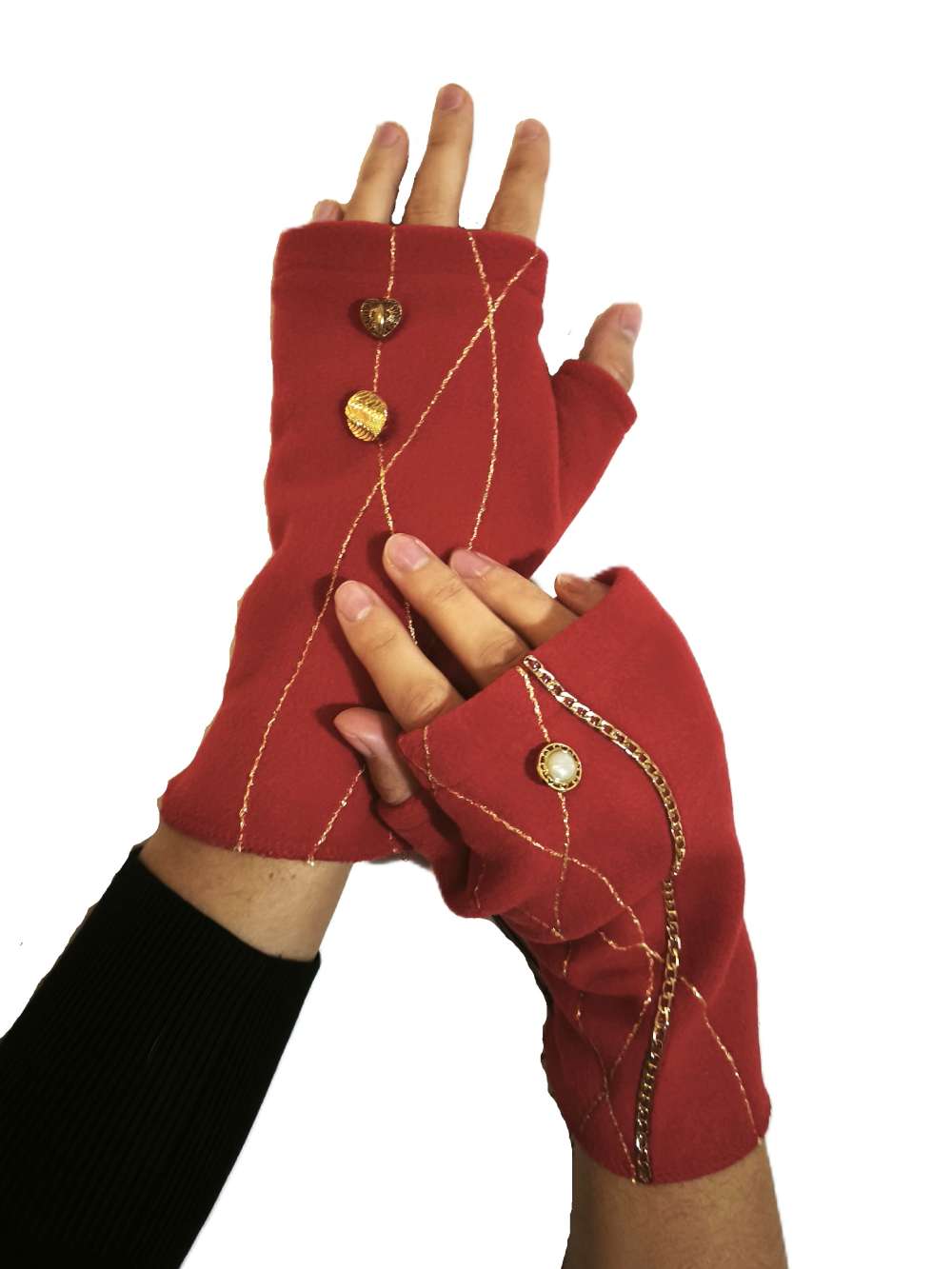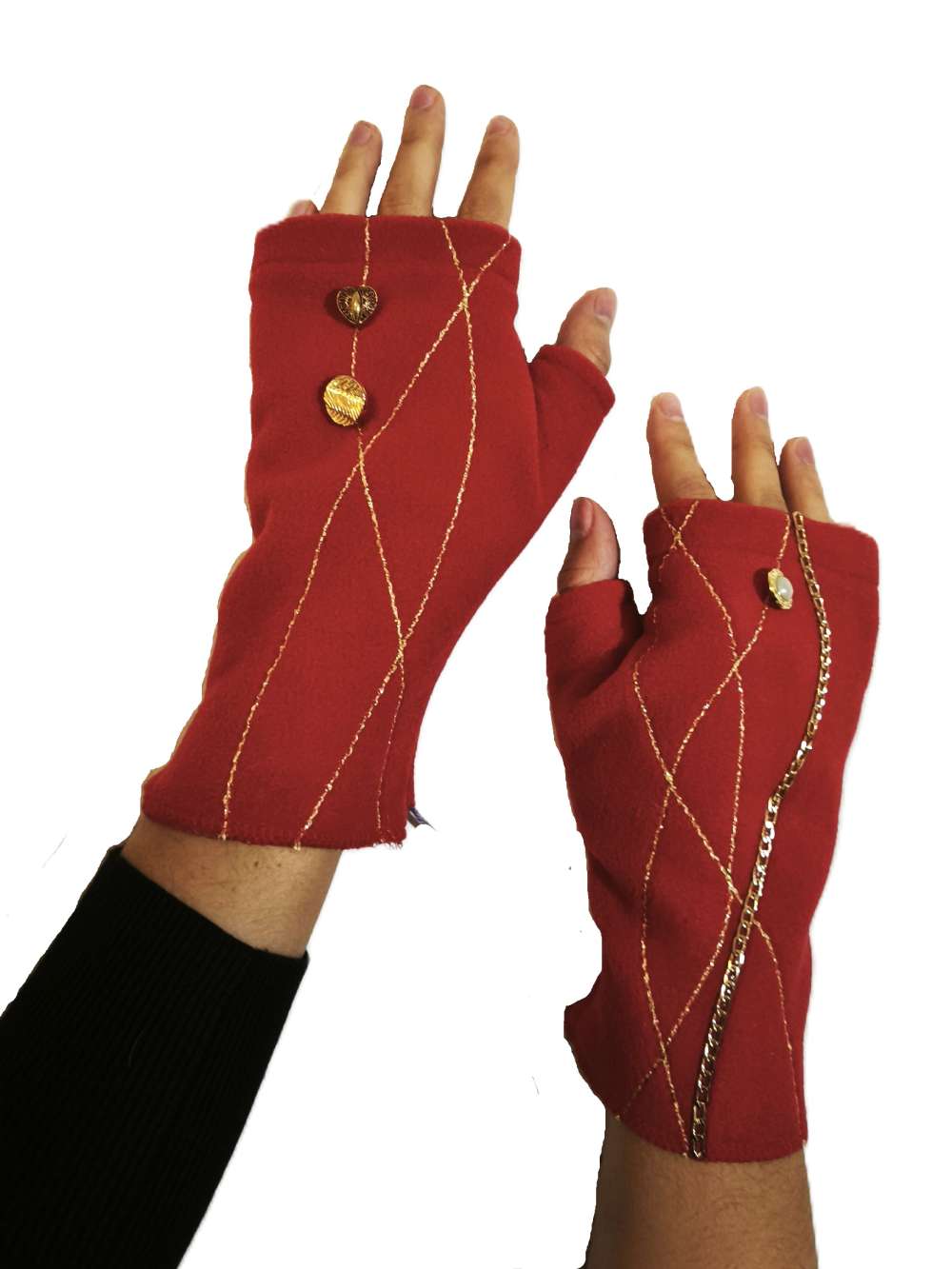 Izdelane so iz toplega in mehkega termoflisa. Dodatno so še pošite z nitkami, okrašene z gumbki in nalepljeno okrasno verižico v zlati barvi.