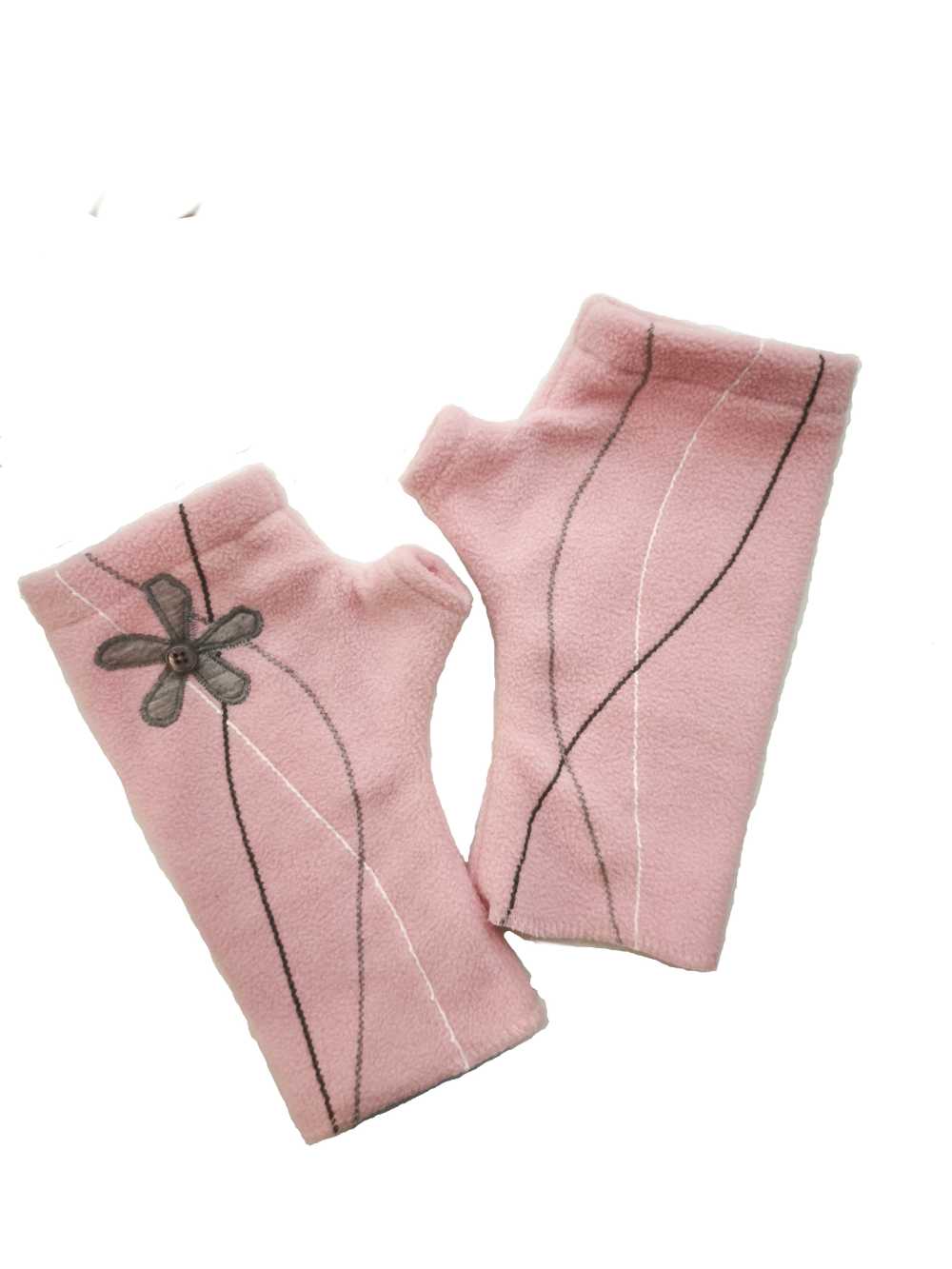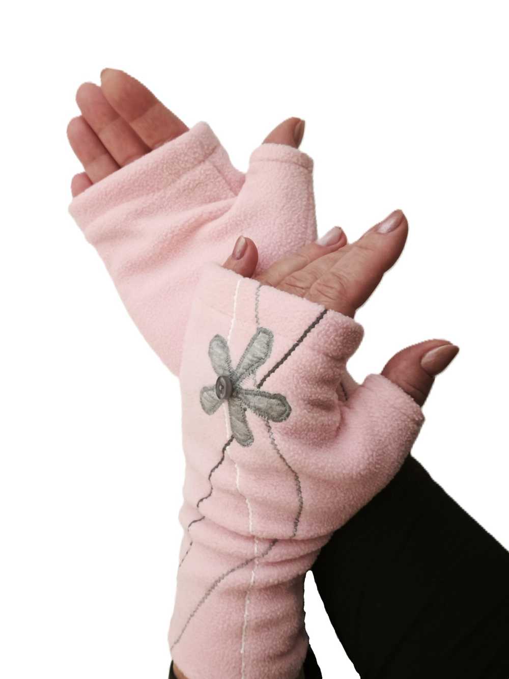 Izdelane so iz toplega in mehkega termoflisa. Dodatno so še na zunanji strani pošite z nitkami, okrašene z gumbki in našito rožico v sivi barvi. Našitek je na levi rokavički.