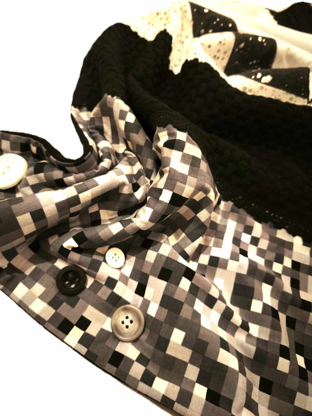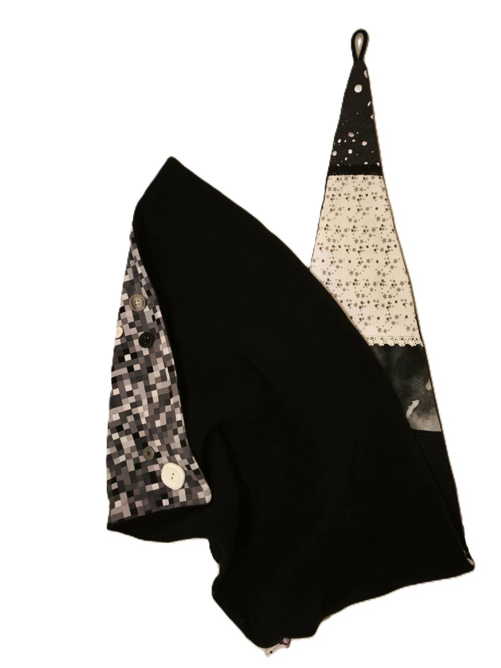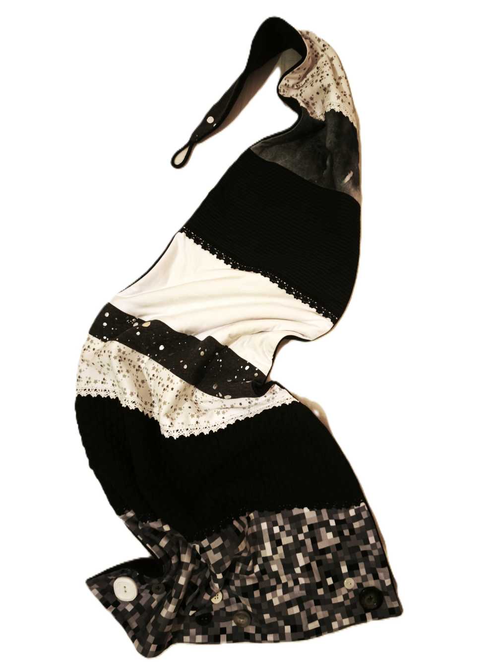 Šal dolge trikotne oblike je topel in lep dodatek v hladnejših dnevih. Nosi se lahko na obeh straneh, s čimer si lahko prilagajamo izgled, kateri nam bolj odgovarja. Ena stran je sestavljena iz več različnih pisanih in enobarvnih barvno ujemajočih delov, druga stran je narejena iz termoflisa, ki deluje mehko in toplo na telo.