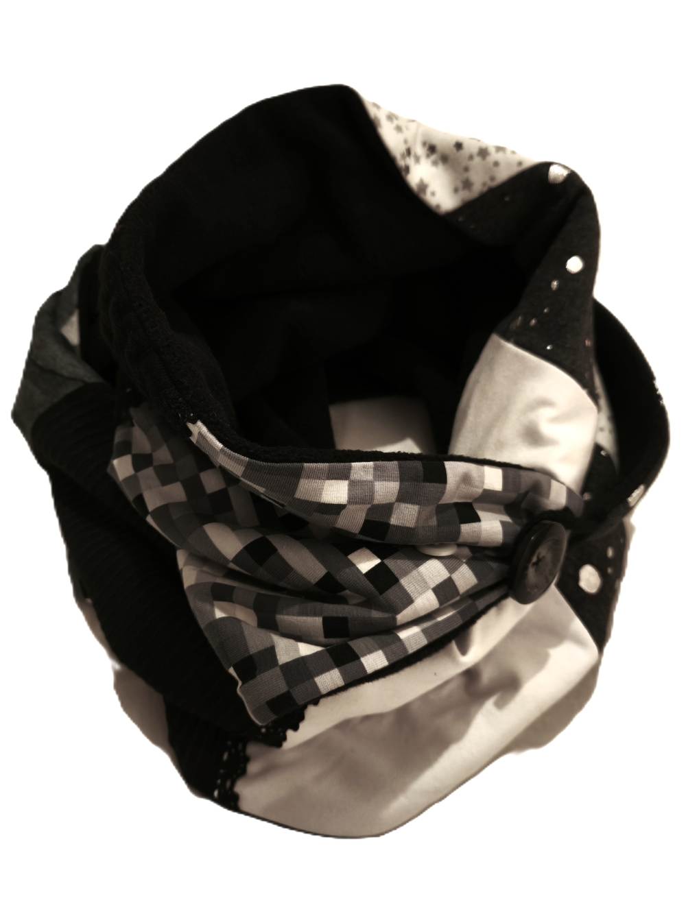 Na eni strani je zašita zanka za zapiranje z gumbi, ki so prišiti na drugi strani za boljše fiksiranje šala okrog vratu.