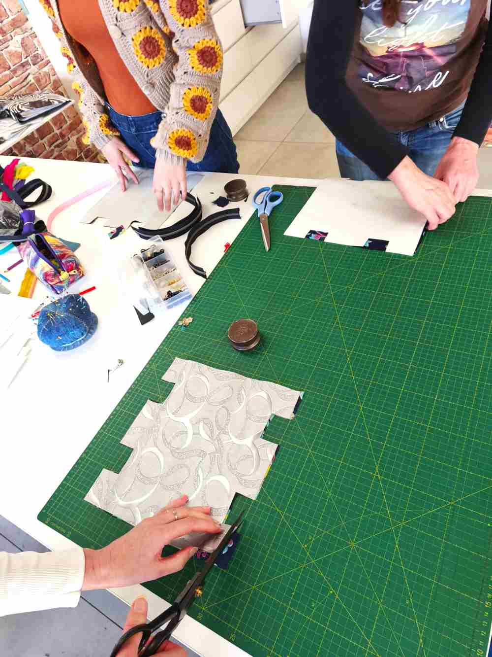Na tečaju material za toaletko izrežeš po kroju, sešiješ in končni izdelek odneseš s sabo. Ostane ti tudi kroj za toaletko. Ves material (blago, sukanci, zadrga, škarje) je vključen v ceno.